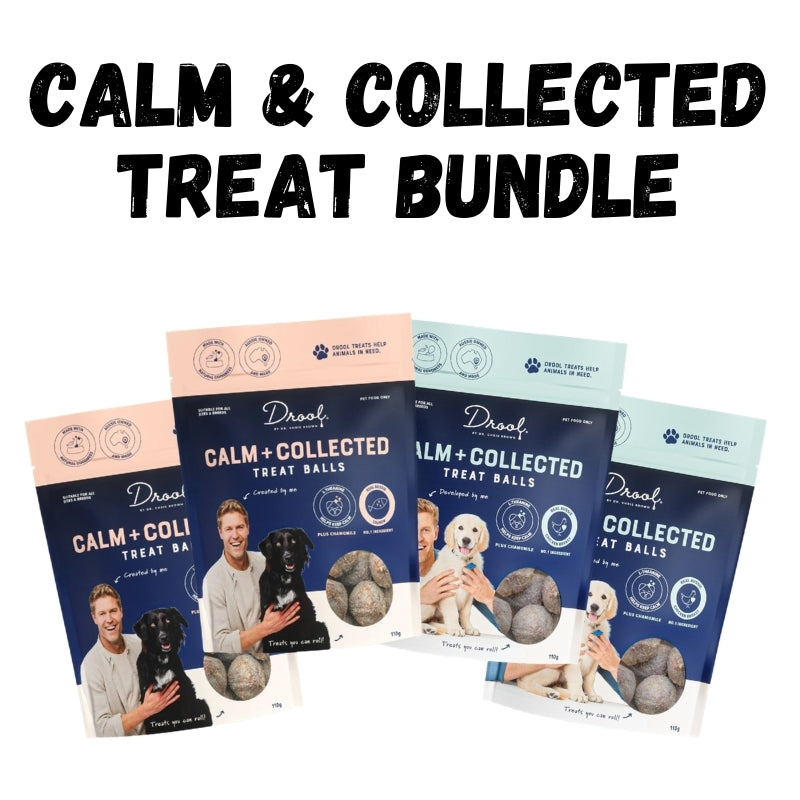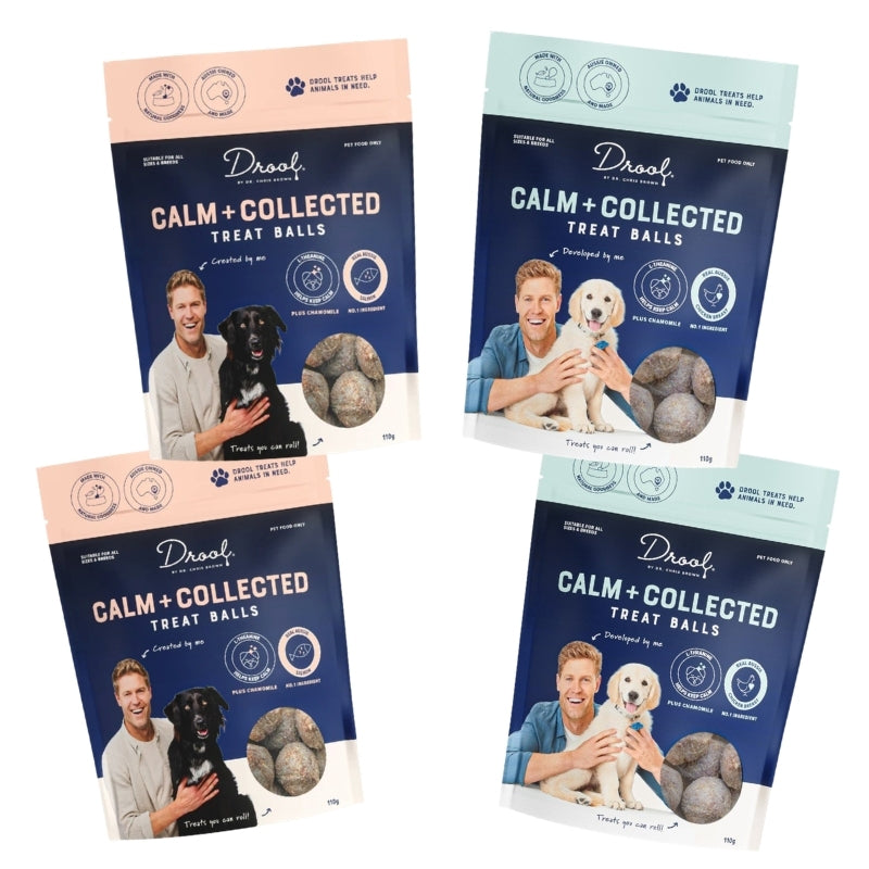 This bundle includes FOUR packets of our Calm & Collected range of treats by Drool! Drool by Dr. Chris Brown’s Calm & Collected treats are expertly crafted to help dogs manage stress and anxiety. Made with Chicken or Salmon your dog can enjoy all natural treats that are made in Australia